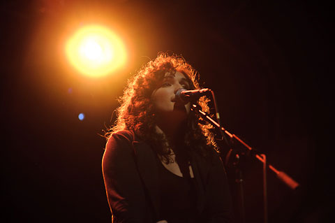 Entering the gig, it was hard to tell if we were at a rock concert or were in store for a concerto–though the plaid-clad, bespectacled college hipster set did a bit to quell the later notion. Still, the opening act wailing on a violin–Owen Pallett, naturally– in this posh-looking concert hall did little to shake the aforementioned high brow affair. The lighting was a bit strange as well. At times, they would dramatically switch from dark to house lights in mid-tune and the high beam-like stage lamps sometimes made me feel like I was being punished for occasionally, um, OK, frequently, gawking at backing vocalist Haley Dekle.